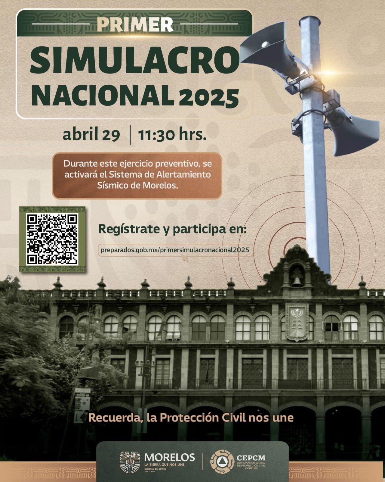 La Coordinación Estatal de Protección Civil Morelos (CEPCM) llamó a la ciudadanía a participar de manera responsable en el Simulacro Nacional 2025, que se realizará el próximo martes 29 de abril a las 11:30 horas. Este ejercicio es convocado por el Gobierno de México, a través de la Secretaría de Seguridad y Protección Ciudadana (SSPC) y la Coordinación Nacional de Protección Civil (CNPC).